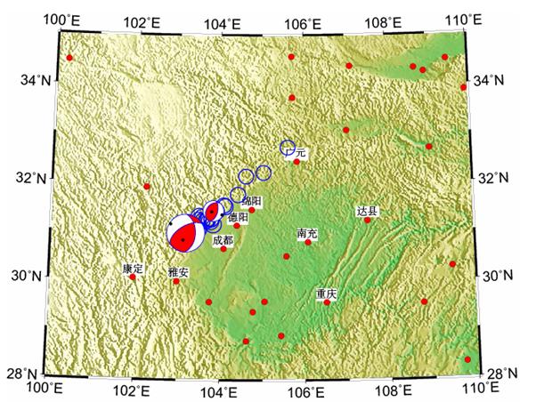 根据这次地震震源机制解资料推断,汶川发震是因龙门山构造带前缘主边界断裂—映秀断裂,由西向东逆冲运动的结果,破裂面向西倾,倾角约60。根据主震和余震分布情况,初步推断这次大地震属于单向破裂地震,破裂方向主体受北东向龙门山构造带控制(图1)。