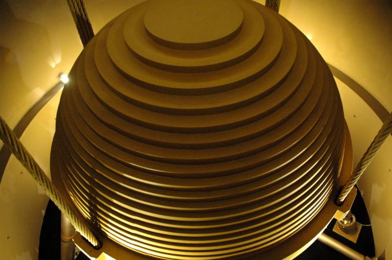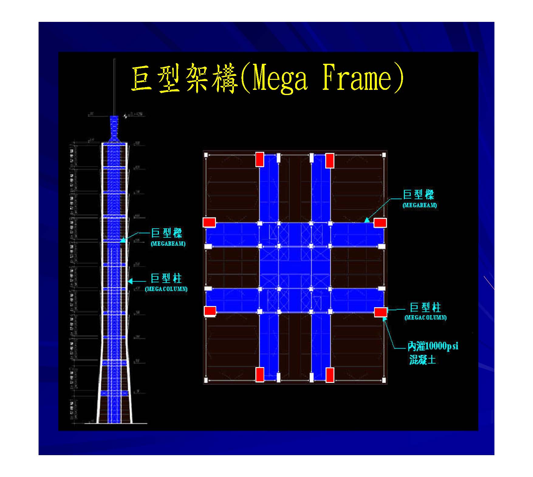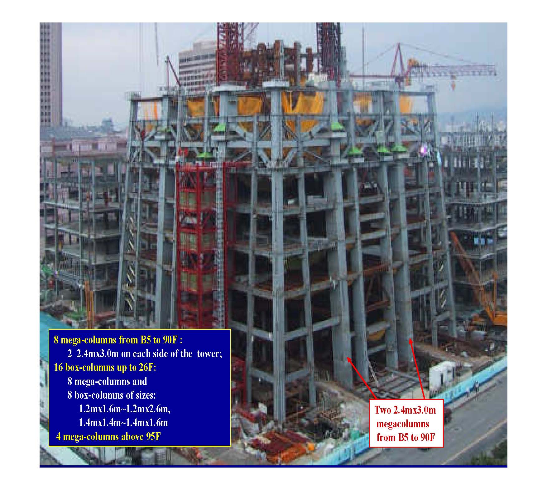 | 采用“巨型结构”,在大楼的四个外侧分别各有两根巨柱,共八根巨柱,每根截面长3m、宽2.4m,自地下5楼贯通至地上90楼,柱内灌入10000 psi高性能混凝土,外以SM570M高性能钢板包覆。核芯区8层以下采用600mm厚钢筋混凝土剪力墙结构,9层以上采用钢支撑结构。沿高度设置巨型桁架11道。采用了φ5.5m重达660吨的世界上最大TMD调质阻尼器,它用41层厚度为125mm的钢板焊接而成,可以减少塔体侧移40%。 | |||