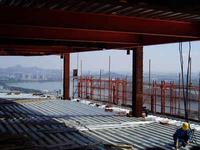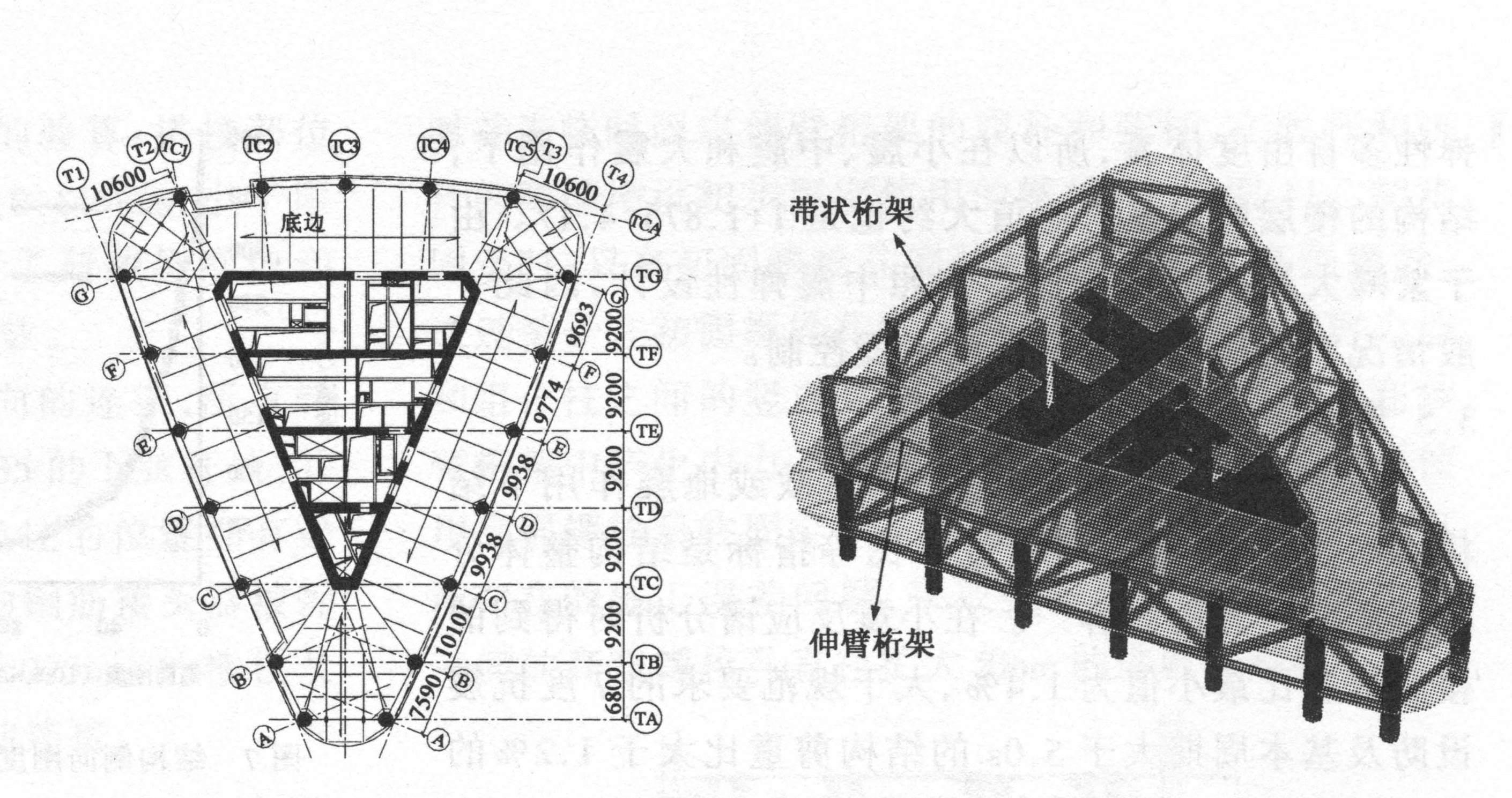 | 采用带有加强层的钢筋混凝土核心筒体—钢结构外框架混合体系,在层10、35、60处共设置了三个加强层。塔楼平面呈三角形,核芯筒位于平面中心,剪力墙厚度在1500mm到400mm范围内变化。外框柱为φ1750~900mm型钢混凝土组合柱。在每个加强层设置高8.4m的伸臂桁架。 | |||