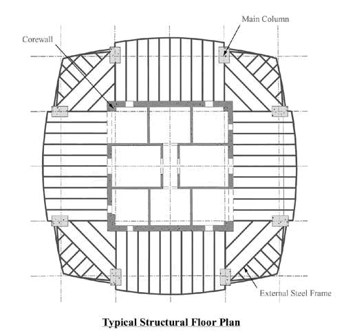 | 采用钢-钢筋混凝土混合结构,由型钢混凝土巨型柱+混凝土芯筒+钢梁组成结构受力体系,底层剪力墙厚1.25~1.5m。塔楼周边设置8根超大型型钢混凝土结构柱,柱底部尺寸为2.3×3.5m,底到中层部分采用C60混凝土、中到顶层采用C45。沿塔楼高度设置三道刚性加强层。 | |||