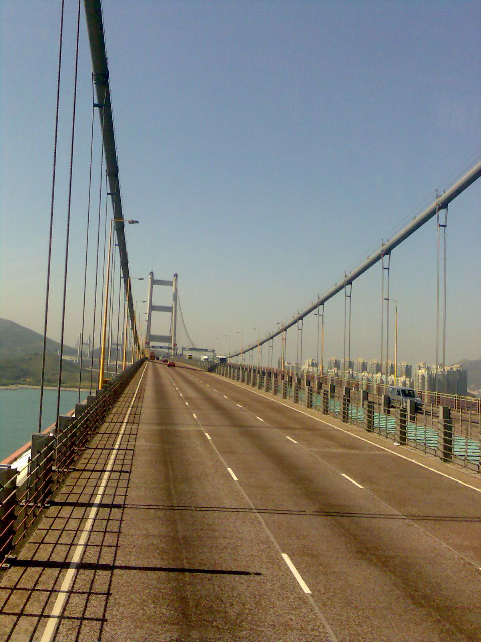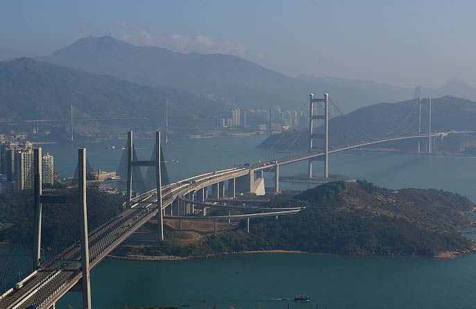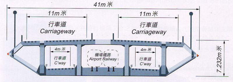 | 桥全长2200米,公路铁路两用悬索桥,采用双层式设计,桥的露天上层为双程三线行车线,下层则为二条地铁东涌线及机场快线的铁路和和二条供紧急时使用的单线行车道路。桥塔高131米,在青衣岛侧采用隧道式锚碇,在马湾岛侧采用重力式锚碇,加劲梁为钢桁架与钢箱梁混合结构,加劲梁高7,54米,高跨比1/185,纵向桁架之间为空腹式桁架横梁,中部空间可容纳行车道及路轨,大桥上层桥面中部和下层桥面路轨两侧均设有通气空格,形成流线型带有通气空格的闭合箱型加劲梁。主缆以空中绞织法建造,由91条缆束组成,直径1.1m。 | |||