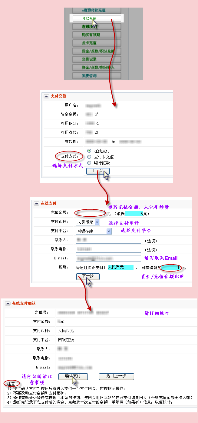 3. 进入支付平台网页,按提示操作,等待返回本站的在线支付结果网页;