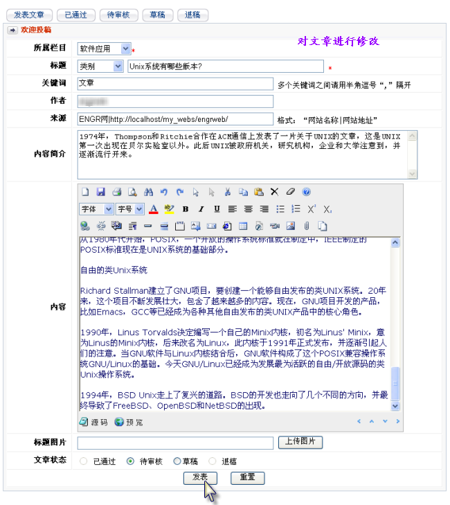 3. 点击“编辑”链接,进入文章修改对话框,对文章进行修改