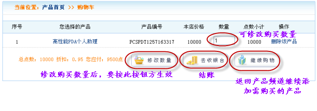 3. 检查您产品购物车内选择的产品,修改购买产品的数量、删除或添加部分产品,点击“去收银台”结账