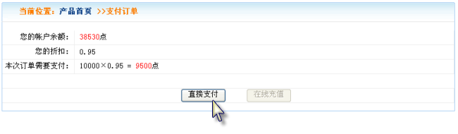 5. 此时进入支付购买网页,请仔细核对点数。若帐户点数足够,可按“直接支付”按钮进行支付,否则按“在线充值”进行点数充值。