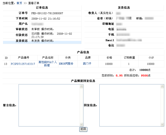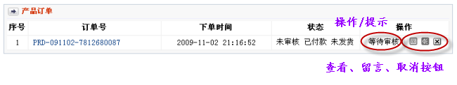 状态列显示订单的当前状态;操作列的操作有:查看、留言、取消,并显示操作提示。在未审核状态下,可以进行取消操作。但取消操作不会立即生效,需频道管理员同意。当状态列显示为‘已取消’时,才表示取消操作生效。订单取消后,会退还订单消费的点数。