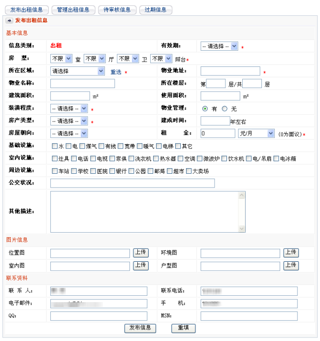 2. 此时进入会员中心,显示发布出租信息页面