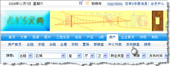 1. 登陆ENGR网,进入“房产频道”,点击栏目栏的“发布楼盘”链接