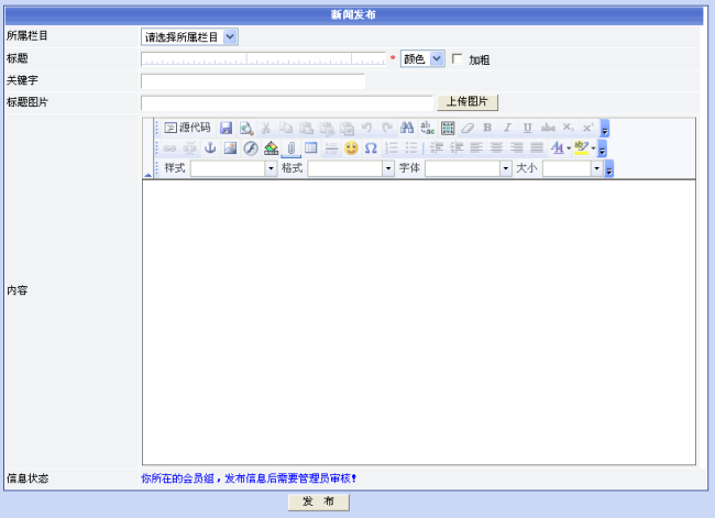 3. 点击“新闻发布”菜单链接,显示新闻发布页面,填写各项内容