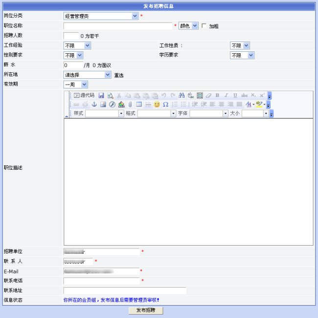 3. 点击“招聘发布”菜单链接,显示发布招聘信息页面,填写各项内容
