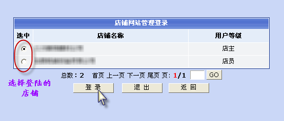 2.此时显示店铺网站管理登陆页面,页面显示会员可以管理的店铺名单(会员必须是店铺中的店主、经理、店员等级),选择登陆的店铺,点击“登录”进入店铺后台