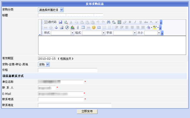 3. 点击“发布求购信息”菜单链接,显示发布求购信息页面,填写各项内容
