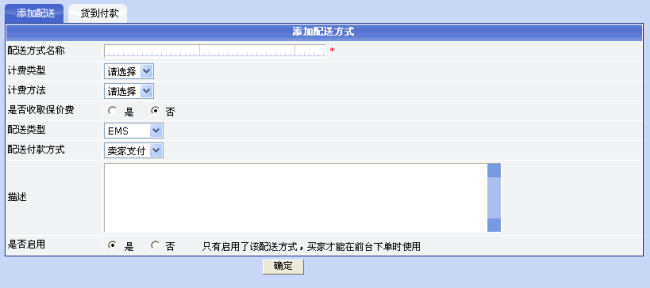 点击“添加配送方式”将显示添加配送方式页面