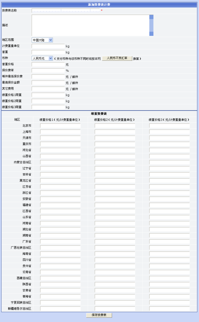 点击“添加资费表计费”将显示添加资费表计费页面