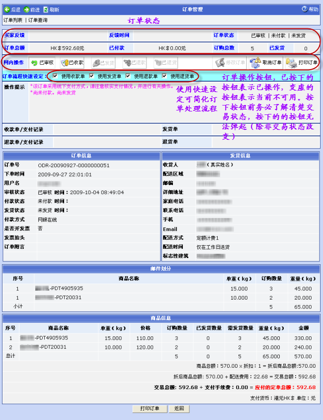 点击‘管理操作’栏“处理”链接可以对该定单进行订单处理和网上交易